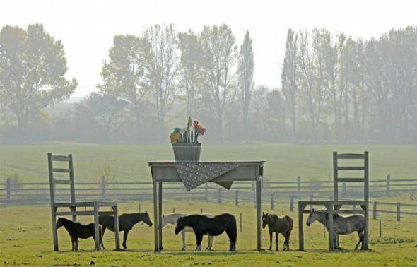 What exactly are you looking at in this deceptive photo?  Is it a family of tiny horses or are the table and chairs gigantic?
