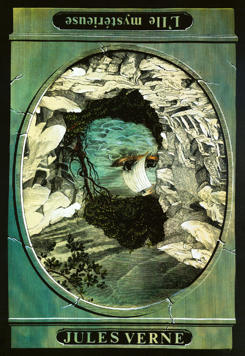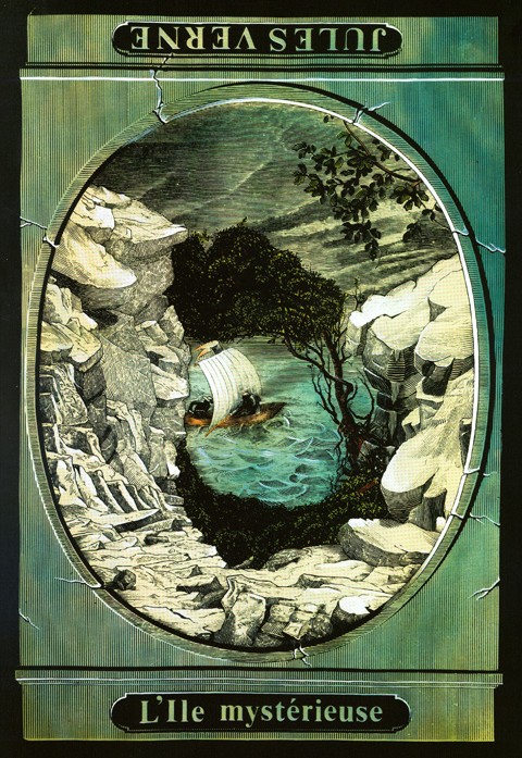 A portrait of author Jules Verne can be seen below. Turning the picture upside down reveals a small ship can be sailing past an opening in the rocks.