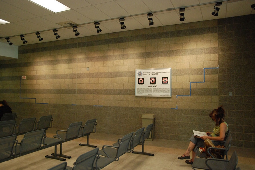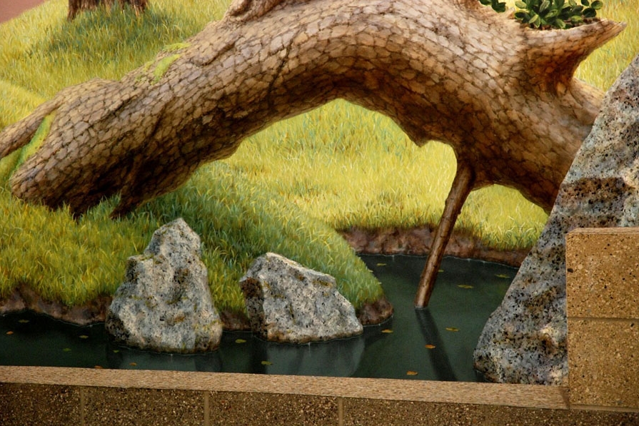 His 2007 mural below located in the visitors lobby of the Juvenile Hall in Sacramento, California was commissioned by the Sacramento Metropolitan Arts Commission. It looks as if there is a cut out in the wall leading to an area with trees, green grass, rocks and a small stream. In reality, the entire scene is painted on a flat surface.