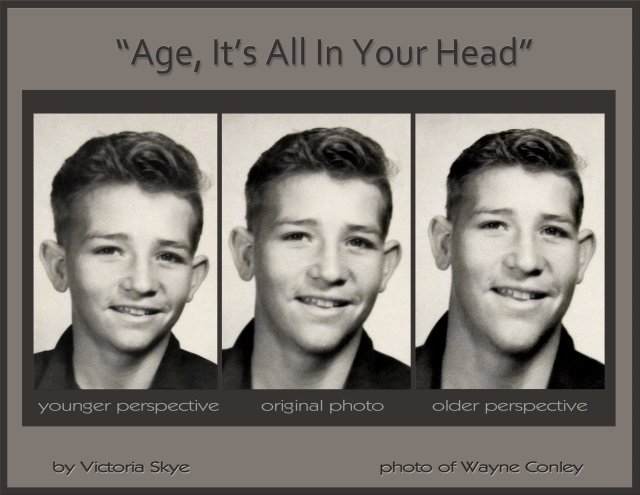 This is essentially an anamorphic illusion from Victoria Skye and was a finalist at the 2014 Best Illusion of the Year Contest. The photograph in the center marked ‘Original Photo’ is a normal, unaltered photograph of a young boy. The photograph is then tilted forward (far left) and backward (far right) to present slightly different viewing angles. The result is that the three images line up together to show what looks like an “age progression” for this particular boy. He ends up looking younger in the photograph on the left and older in the photograph on the right.