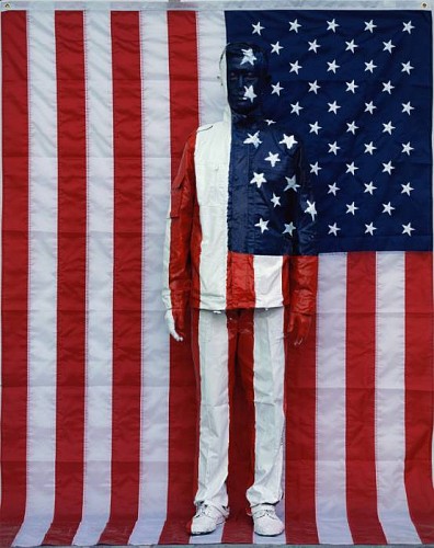 This is an older photograph, taken in 2007, but I had not seen it before.  Using some red, white, and blue paint, Liu Bolin camouflages himself in front of the stars and stripes.  The official title of this work is Hiding in the City No. 62 – American National Flag.