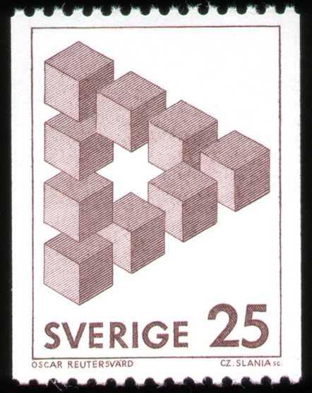In the 1980’s, Oscar Reutersvärd (the father of the impossible figure) was honored in Sweden with the release of three postage stamps featuring his impossible art. These items were not in circulation for very long and have since become sought after collectibles. Below is one of the stamps that features a twisted figure that bends in an impossible manner.