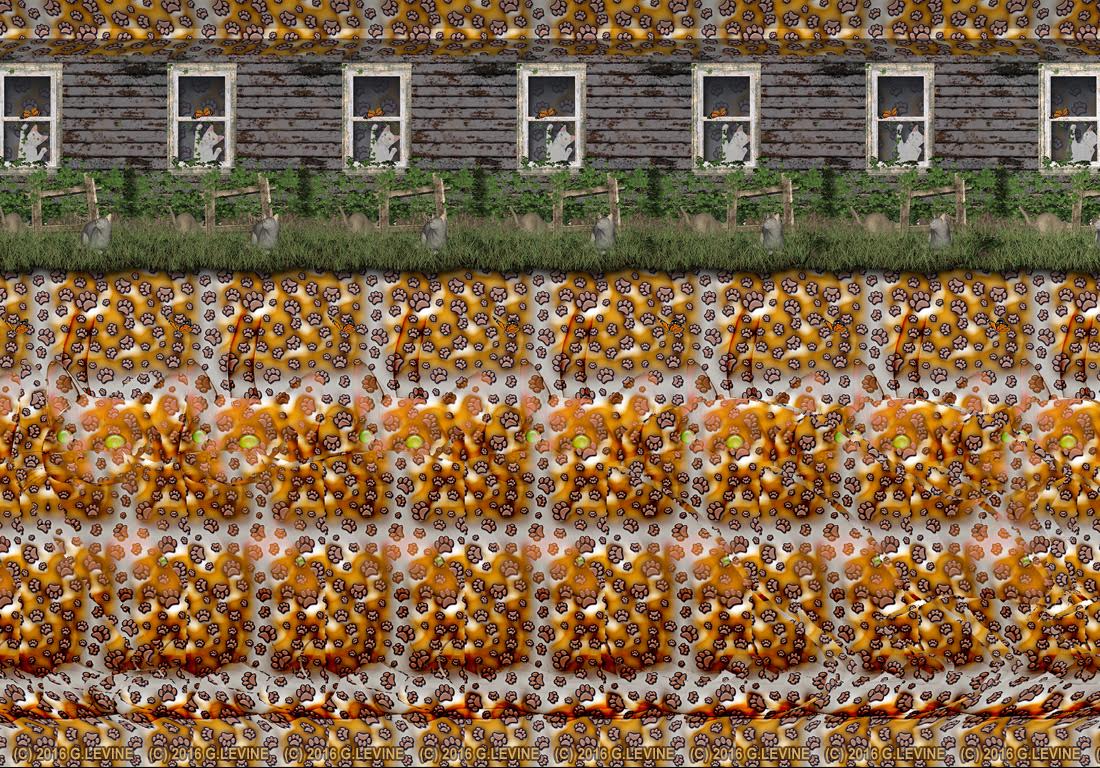 Gene Levine recently emailed a couple of new 3D stereograms that he has been working on.  Below is one of these images which he calls Cat House.  If you stare at this pattern, a hidden image will reveal itself.  Can you figure out what it is?