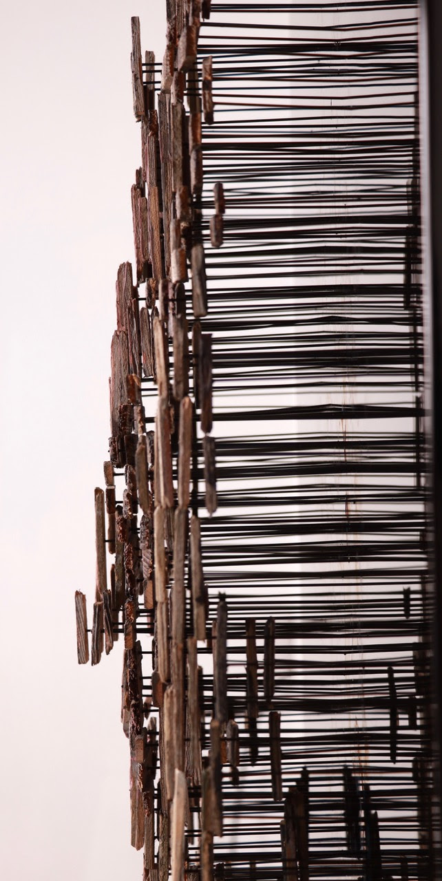 We previously featured another piece created by Andrew Myers called An Artist’s Winter. He has traditionally used an very unlikely medium for his artwork – painted screws. That makes this work the first of its kind for Andrew. Myers created this composite portrait using broken recycled wood pieces. He meticulously arranged, painted, attached to steel rods, and inserted into a wood panel at different lengths to create a three dimensional image. The final piece is quite large measuring 36″ x 36″.