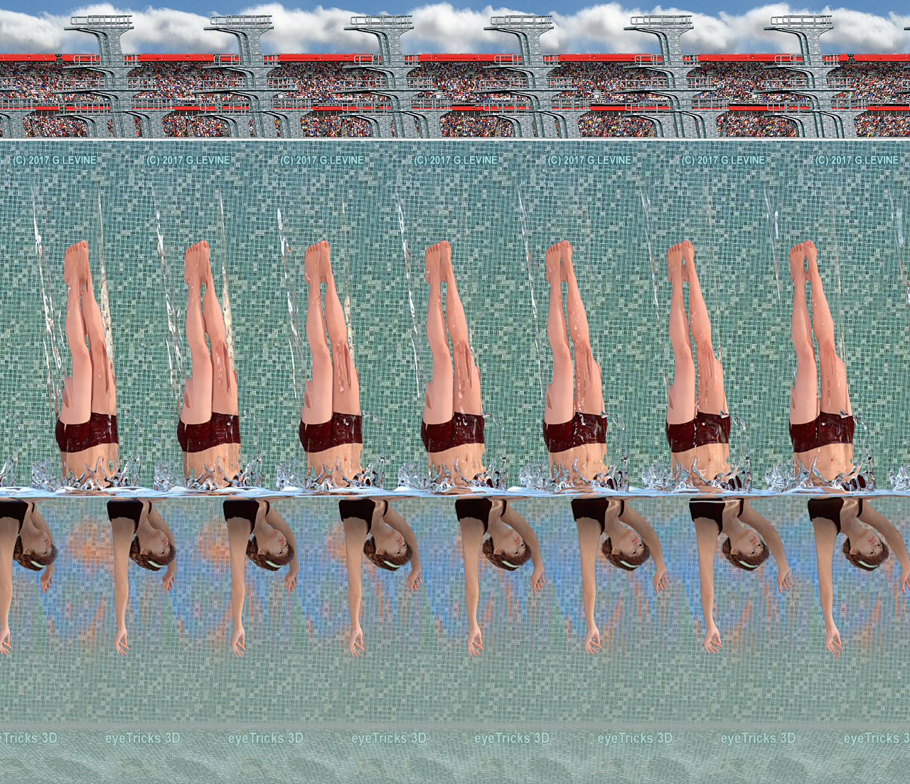 Here’s a new stereogram from Gene Levine.  There is no hidden image here, but if you stare at it, the individual columns will fuse together to form a 3D image of the woman diving into the water.  This image took Gene quite a bit of time to create, but I think the end result was absolutely worth the effort involved.