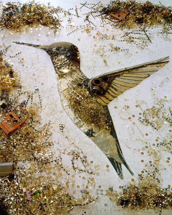 Brazlian artist Vik Muniz is no stranger to transforming trash and other discard items into beautiful works of art. We previously featured a video in which Muniz used hand-torn scraps of paper from magazines to recreate Van Gogh’s The Starry Night. In 2012, Muniz created a series of composite artworks under a series titled Scrap Metal. One of these works, presented below, shows a hummingbird created from various discarded pieces of scrap metal. You can understand the full scale of this artwork by observing the car doors that are incorporated into the photograph. I would be very curious to know how high off the ground the camera was when this photograph was taken.