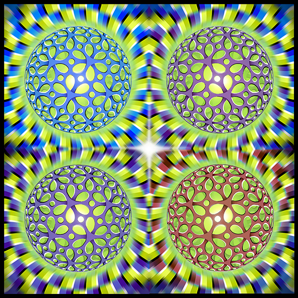 The four spheres (which the artist calls baubles) appear to be moving. If you move your eyes rapidly around the image, you will find that the motion effect is enhanced.