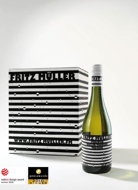 Fritz Müller Perlwein is a German sparkling wine made by Jürgen Hofmann. Their unique packaging and labels use horizontal black and white stripes, and this poster uses offsetting black and white stripes a “phantom” bottle of their product. No bottle exists here, but you certainly cannot help but to see it.