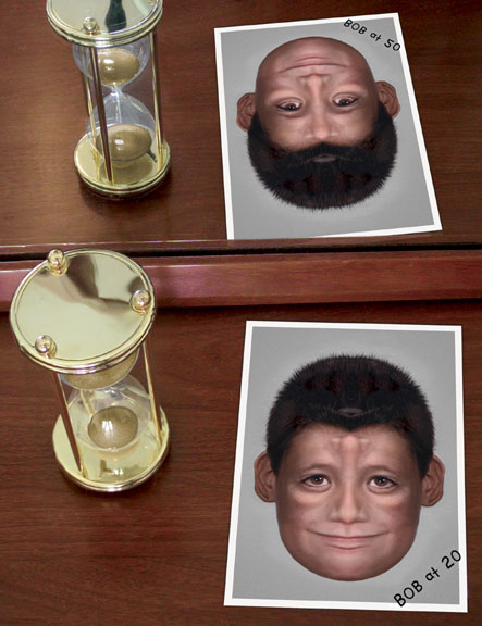 Robert Fathauer created this limited edition digital print titled “Looking Through Time” in 2005. It features a reversible portrait of a man that can be seen as two different faces when viewed normally and in the mirror. Fathauer found inspiration for this design in the work of Rex Whistler who created a series of very exceptional inverted faces. The photograph on the dresser features a young man with the caption “Bob at 20”. The reflected portrait shows an older version of the same man with the caption “Bob at 50”. In the span of 30 years, the man has lost all of his hair, grown a full beard, and added some wrinkles to his brow.