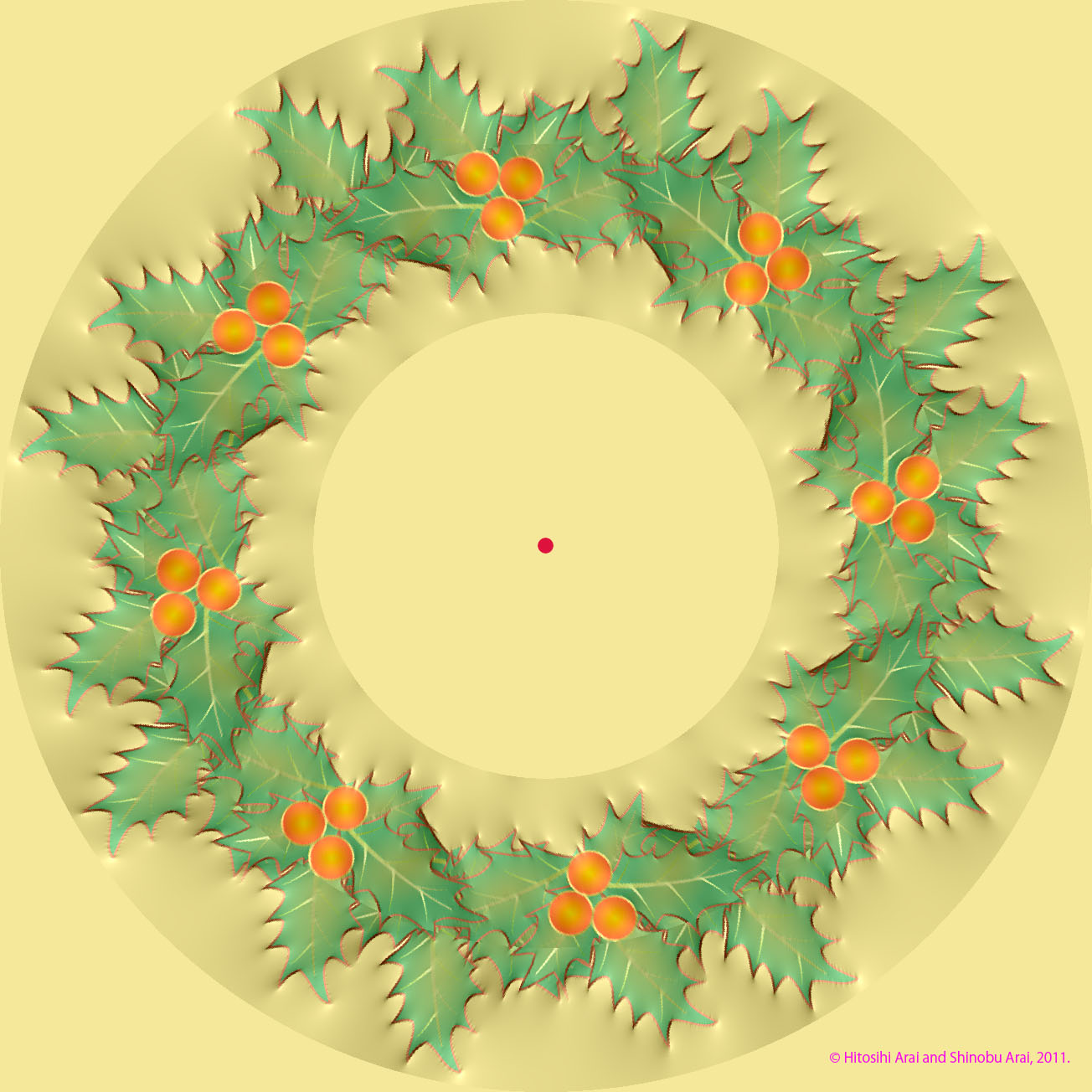 Mathematical vision scientists Hitoshi Arai and Shinobu Arai created this unique wreath image in 2011. If you focus your eyes on the red dot in the center of the wreath and move your head toward your monitor and then away from it repeatedly, you will notice that outer portion of the wreath appears to move to the left and right.