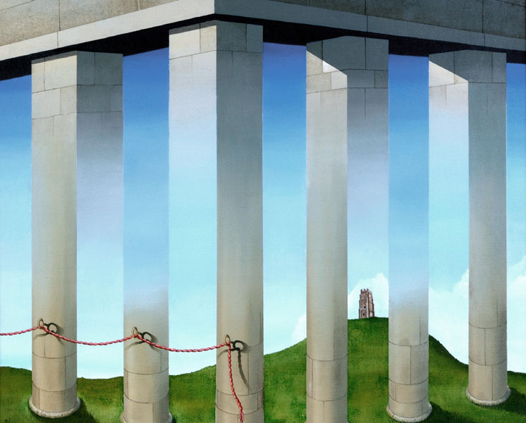This painting from British surrealist artist Norman Parker is a reworking of a familiar optical illusion. Glastonbury Tor, a holy hill in Southwest England, can be seen in the background through the impossible columns / pillars. As you move from the top of the painting to the bottom, the four square columns transform into six round pillars.