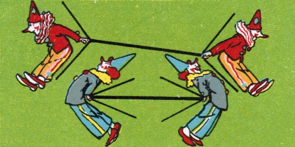 Which is the longer of the two straight rods stretching between the hands of the two pairs of clowns? Before you get your friends to pass judgment, check your own decision with the aid of a ruler. You will find that both lines are exactly the same length.