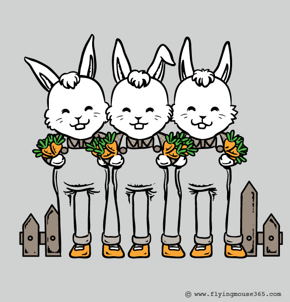 How many legs can you count on the three rabbits below? Does it seem like they aren’t lining up quite right? Malaysian tee shirt designer Flying Mouse (aka Chow Hon Lam) no doubt drew inspiration from Roger Shepard’s impossible elephant (or L’egs-istential Quandary) when creating this design.