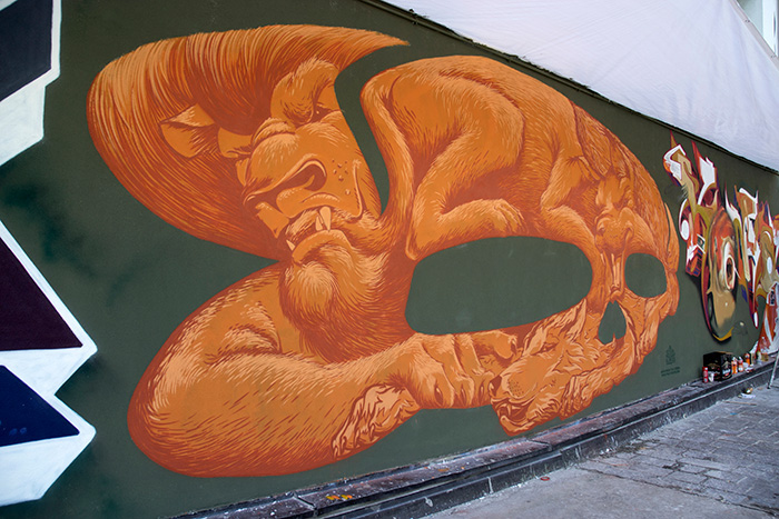 Truly Design drew this entire anamorphic composition by hand, which means that they did not use any projectors to help with getting the distortion correct. It was painted in 2013 at the 39C Graffiti Jam in Bolzano, Italy. When viewed from the proper angle (see image below), an image of an orange skull can be seen.
