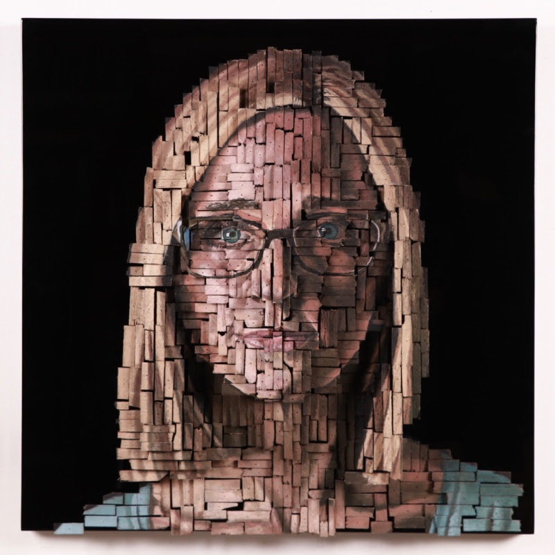 We previously featured another piece created by Andrew Myers called An Artist’s Winter. He has traditionally used an very unlikely medium for his artwork – painted screws. That makes this work the first of its kind for Andrew. Myers created this composite portrait using broken recycled wood pieces. He meticulously arranged, painted, attached to steel rods, and inserted into a wood panel at different lengths to create a three dimensional image. The final piece is quite large measuring 36″ x 36″.