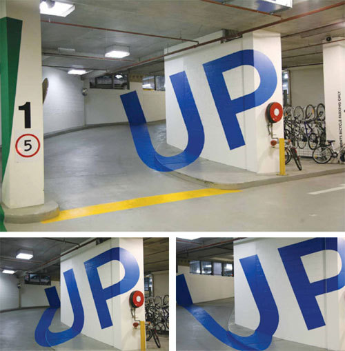 The Eureka Tower Carpark in Melbourne, Australia contains of series of anamorphic letter illusions designed by German artist Axel Peemoeller. The letters can be read perfectly when viewed at certain angles, but appear distorted when viewed from all other angles. The example below shows the how the letters form the word “UP” as a motorist approaches the up ramp.