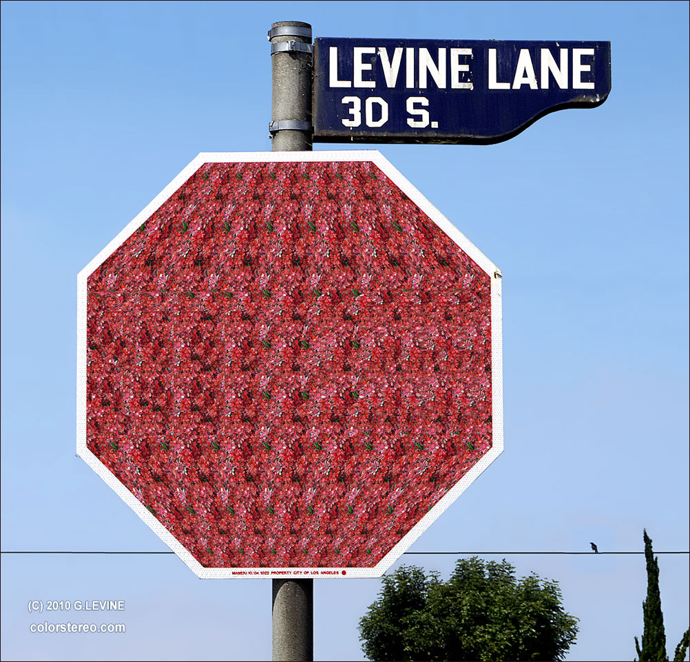Some of my favorite stereograms incorporate realistic photographic elements with a hidden image component. Stereogram master Gene Levine has perfected this technique by injecting stereograms into realistic scenes. His latest book titled Incredible 3D Eye Tricks features one hundred such “scene” stereograms created by himself and co-author Gary W. Priester. Before you try to find the hidden message in the sign, can you guess what it says?