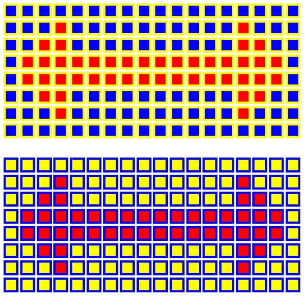 The only difference between the two is the color of the border that surrounds the red squares. The light yellow border used in the top figure gives the red square the appearance of being orange. Image by Brad Honeycutt, the co-author of The Art of the Illusion.
