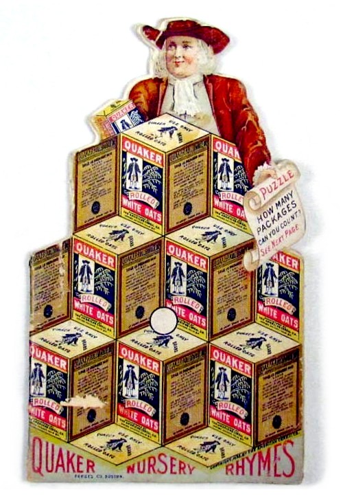 In the late 19th century, Quaker Oats released a pamphlet with an optical illusion on the cover. The paper that the Quaker Man is holding below reads , “How many packages can you count?” Do you see six or seven packages of Quaker White Oats? Both answers are correct depending on how you look at this ambiguous drawing.