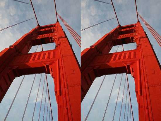 Do the two pillars on the Golden Gate Bridge appear to be parallel or skewed?