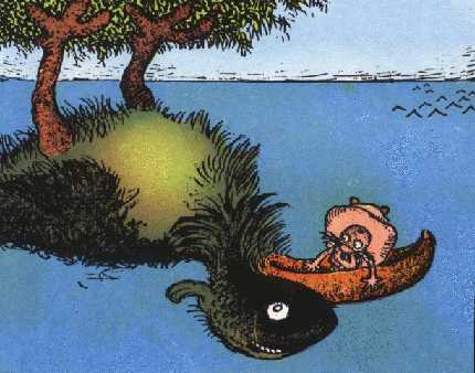Perhaps the most famous image from The Upside Downs of Little Lady Lovekins and Old Man Muffaroo is one that shows Old Man Muffaroo in a canoe being attacked by a fish.