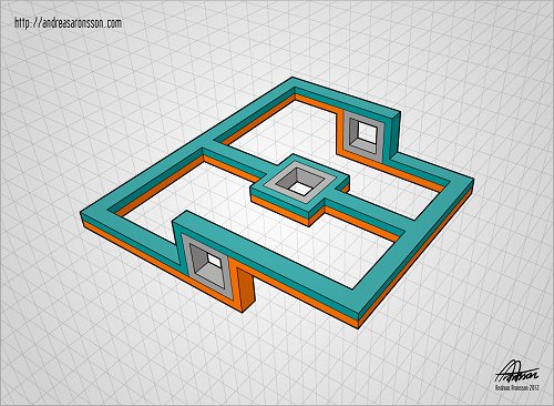 Continue reading this post to see two additional ambiguous cube designs by Martin Isaac. Be sure to also check out his other designs (as well as designs from other artists) at the blog he maintains called Planetary Folklore.