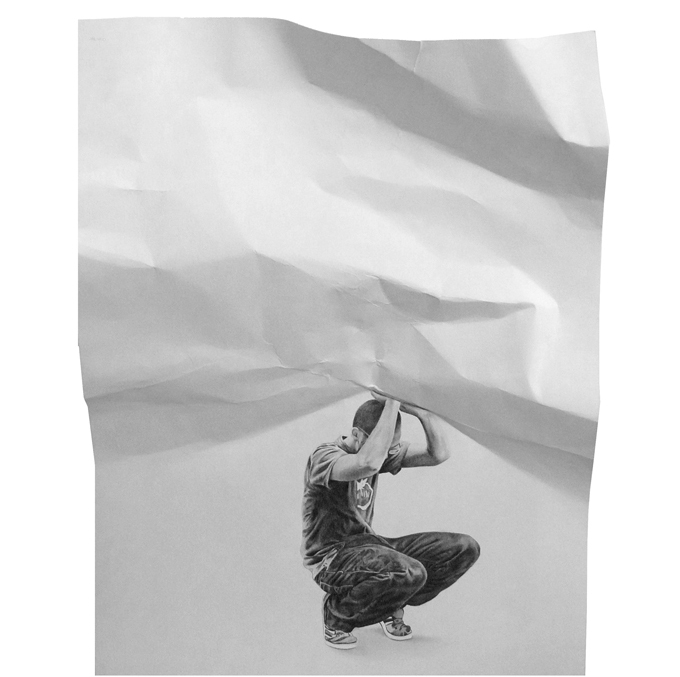 Colombian artist Cesar Del Valle draws realistic images using a pencil and paper. Presented below is his drawing called “Retratos III 7” in which a man struggles to hold up the paper over his head as it appears to be crumpling on him. It is almost as if he is doing everything in his power to stop from becoming a paper ball thrown into a waste basket.