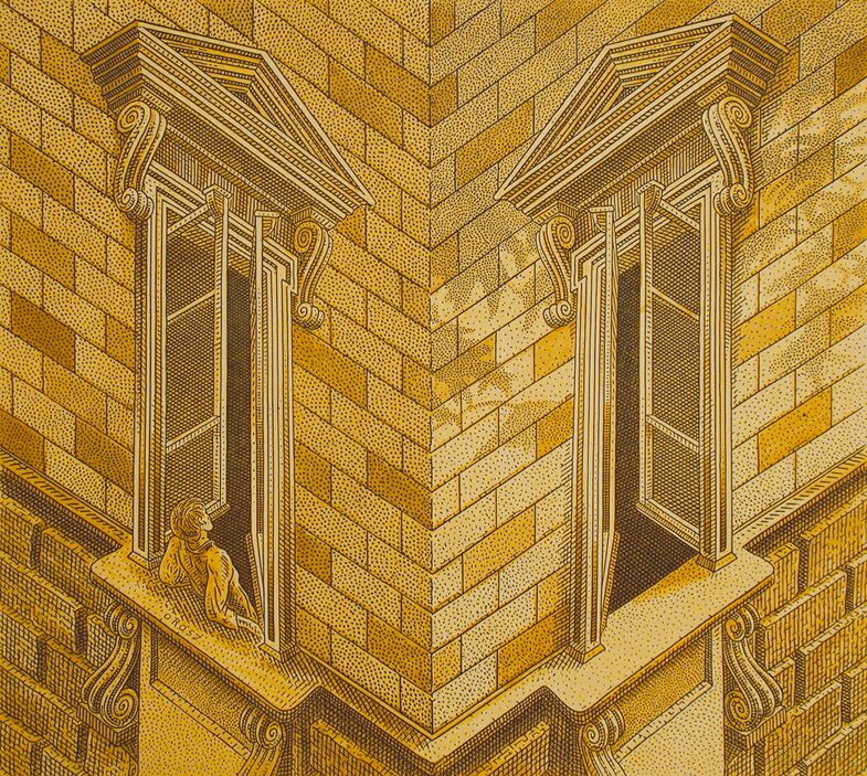 István Orosz is a Hungarian painter and graphics designer, among other things. His work is on par with (or better than) any other artist designing illusion-themed art alive today. In the example below, titled Corner House, Orosz presents two windows that appear to be on opposite sides of a building. At the same time, they also appear to be facing one another making the scene confusing and ultimately impossible.