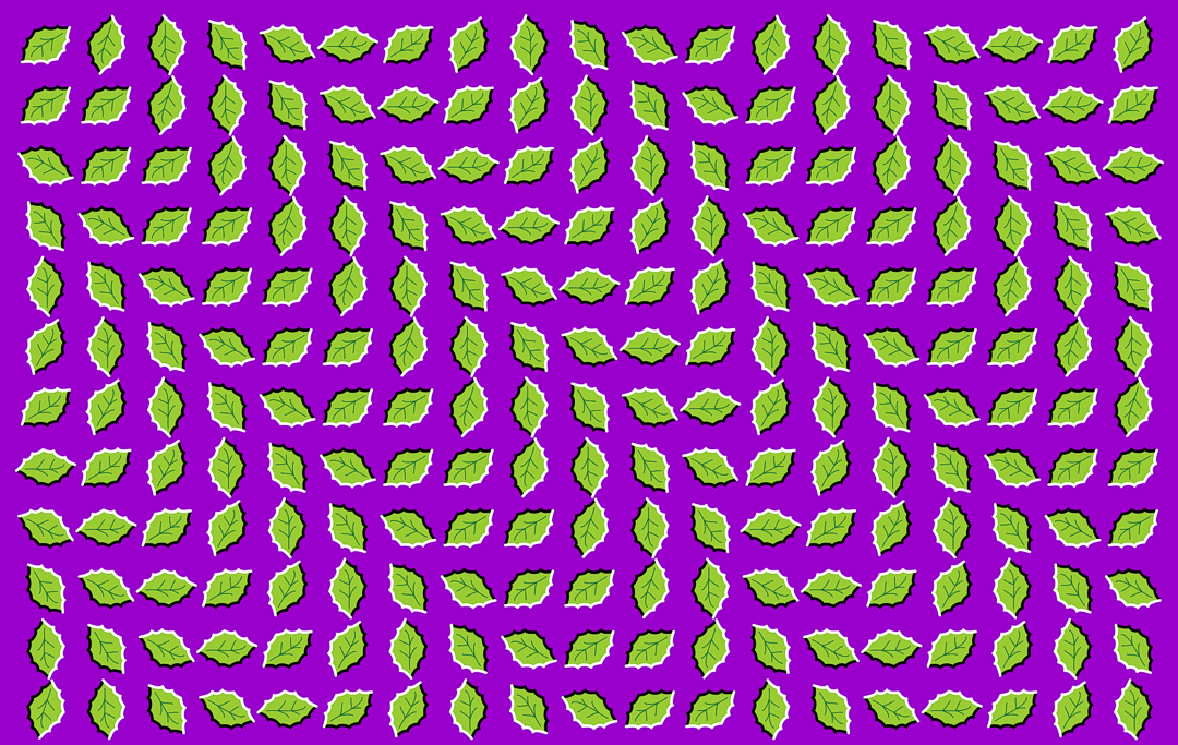 Akiyoshi Kitaoka is a Professor in the Department of Psychology at Ritsumeikan University in Kyoto, Japan. He is well known for his work developing and trying to understand anomalous motion illusions. His most famous work is Rotating Snakes where a series of circular snakes appear to rotate spontaneously. Upon releasing this work to the public in 2003, Professor Kitaoka gained significant notoriety. Presented below is one of his more recent works. This collection of leaves appear to move in a a “waving” pattern as your eyes move around the image.