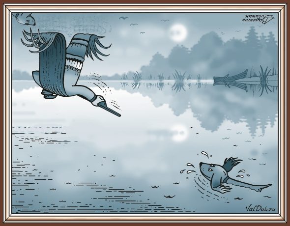 Russian cartoonist Valentine Dubinin illustrated this unique portrait. It depicts a duck hunter in the water getting ready to fire at a duck desperately attempting to flee the scene. The hunter’s dog can be seen in the lower right-hand corner of the image, possibly ready to retrieve the duck if the hunter lands a successful shot.