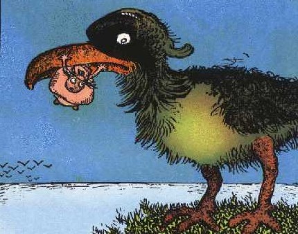 When turned upside down, the image turns into one of Little Lady Lovekins stuck in the beak of a giant bird.
