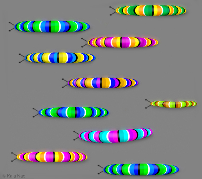 We have featured terrific motion illusions from optical artist Kaia Nao in the past. If you missed them, you may want to take a look at the floating star illusion and tunnel vision. Below, he has created a design that features ten very colorful caterpillars. When you look at the entire image, do they appear to be moving or inching forward?