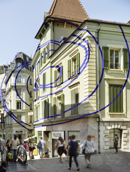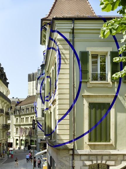 Felice Varini creates large-scale anamorphic works in urban spaces, typically on buildings, walls, and streets. One of his latest works created this year, titled “Objectif gare”, is a series of non-concentric blue circles that can only been seen properly from one specific vantage point. It was created in the city of Lausanne, located in the french-speaking part of western Switzerland.