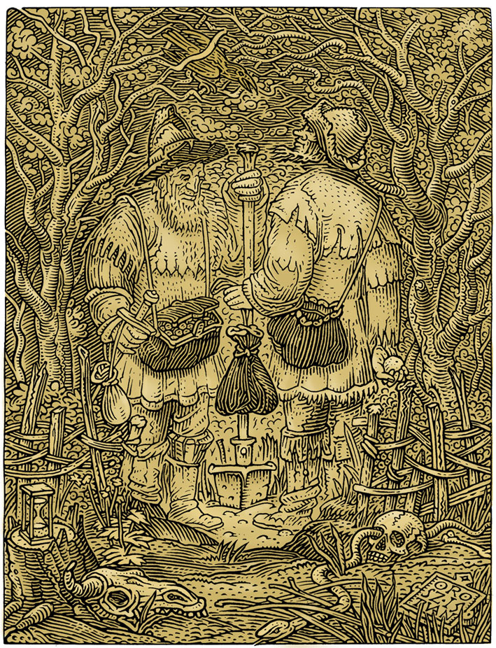 I have always been a big fan of István Orosz’s illustrations, and today’s optical illusion is no exception. If you look at this very detailed illustration that contains two men standing among trees with bags hanging from their shoulders, you may also notice something else. Do you see it?
