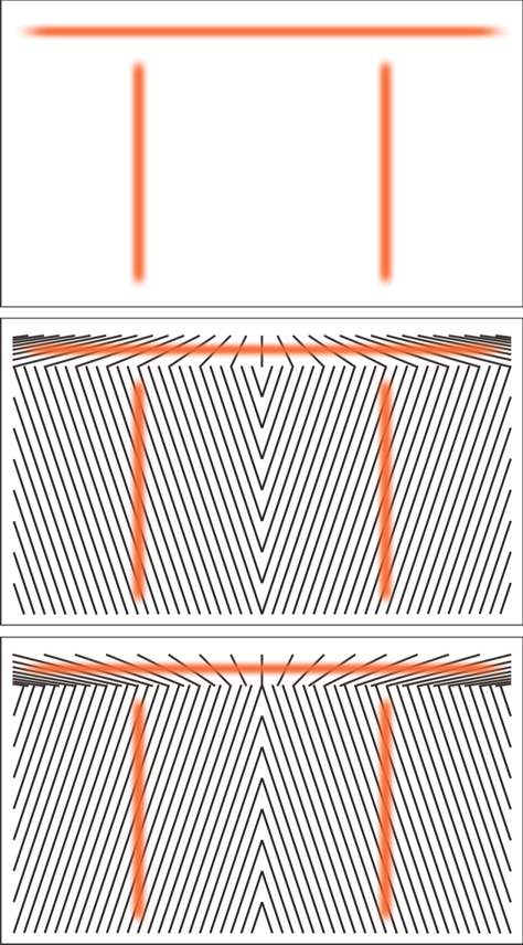 Proferssor Dejan Todorović of the University of Belgrade created this optical illusion that highlights the effects of two different illusions known as the Hering illusion and the Zöllner illusion. The blurred orange lines (representing a Torii, a traditional Japanese gate located in front of a shrine) are identical in all three images. Notice how the background lines in the second image make the orange horizontal line appear to bow downward as the vertical lines seem to tilt inward. By changing the orientation of the background pattern (see third image at the bottom), the orange lines appear to bow and tilt in the opposite direction.