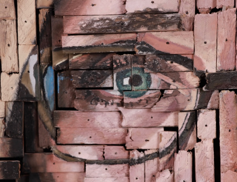 We previously featured another piece created by Andrew Myers called An Artist’s Winter. He has traditionally used an very unlikely medium for his artwork – painted screws. That makes this work the first of its kind for Andrew. Myers created this composite portrait using broken recycled wood pieces. He meticulously arranged, painted, attached to steel rods, and inserted into a wood panel at different lengths to create a three dimensional image. The final piece is quite large measuring 36″ x 36″.