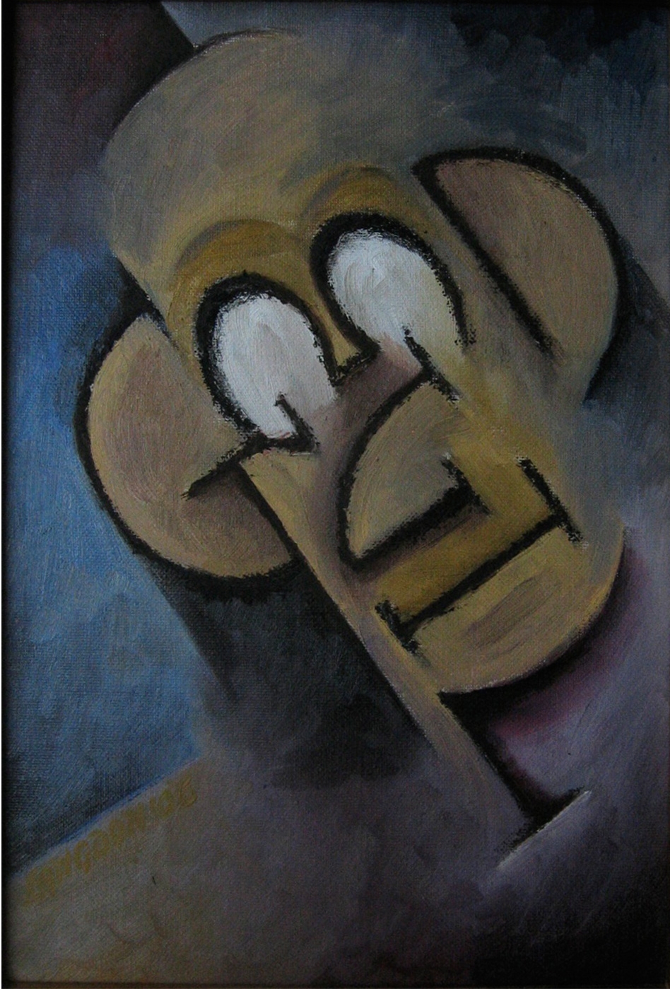 This oil painting, created by John Langdon more than a decade ago in 2006, features two different interpretations. At first glance, this is a painting of a man’s face with very big ears. If you look closely, you may also see two different words incorporated into this ambiguous painting. The man’s ears and eyes can be interpreted to form the word “GOOD” (with the eyes forming the two 0’s). At the same time, his eyes (forming the upper-case letter E), nose, mouth, and chin form the word “EVIL” in a completely different direction.